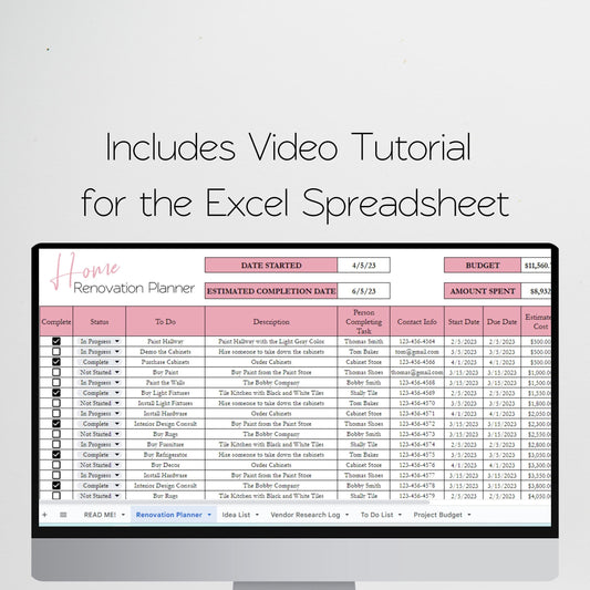Home Renovation Planner Excel Spreadsheet, Home Improvement, Home Remodel Planner Budget