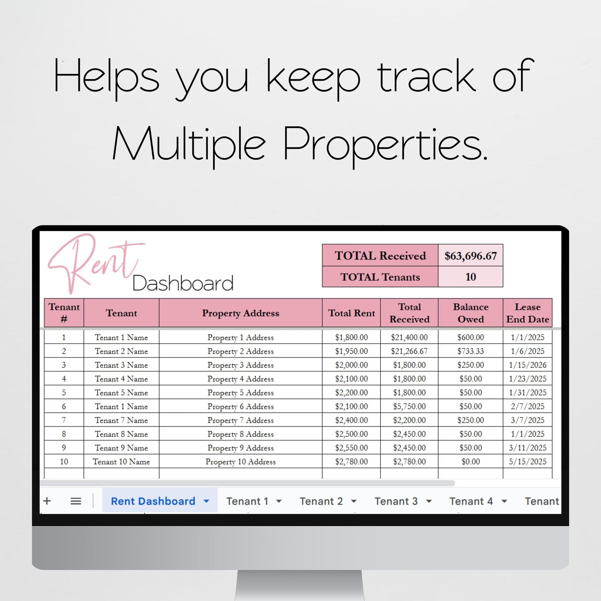 This is a monthly rent ledger to keep track of your payments received from your tenants for your rental properties. You can track late fees, total due, total amount received, and more. You can track up to 10 properties with this sheet. (More can be added if needed, but contact me if you need instructions for that.)